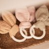 Izdelano je iz skrbno izbranih, varnih in trajnostnih materialov, ki vključujejo naravni les in mehak bombaž. Leseni obroček je gladek, trpežen in prijeten na dotik, kar zagotavlja udobno izkušnjo pri grizenju. Mehka zajčja ušesa iz bombaža ponujajo prijetno teksturo, idealno za raziskovanje in igro. Vse sestavine so brez škodljivih kemikalij in strupenih barvil, kar zagotavlja popolno varnost za vašega malčka.