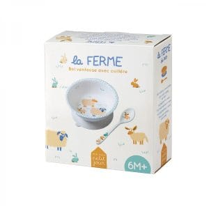 Jedilni set vsebuje krožnik, posodico, žličko in slinček.