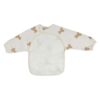 Slinček Teddy Bear ni le praktičen, ampak tudi izjemno simpatičen. Z ljubkim motivom medvedka v nevtralnih tonih bo hitro postal priljubljen del otroške garderobe. Opremljen je tudi z nastavljivimi trakovi na hrbtni strani, ki omogočajo enostavno prilagajanje velikosti, tako da je primeren za malčke različnih starosti. Rokavi so dovolj dolgi, da pokrijejo celotne roke, kar preprečuje umazanijo na oblačilih, ne da bi omejevali otrokovo gibanje.