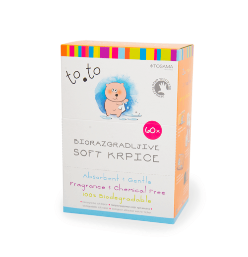 To.to biorazgradljive soft krpice za enkratno uporabo so puhasto mehke, zelo vpojne, čvrste ter koži in okolju prijazne, saj so biorazgradljive. So posebej primerne za tiste, ki želijo za nego nežne otroške kože uporabljati le naravne materiale. Izdelane so iz 100 % naravne viskoze. Nepogrešljive so pri vsakodnevni negi otroka, tako pri previjanju, kot tudi pri prehranjevanju, na sprehodu ali pri igranju. Kot suhe jih lahko uporabljamo za brisanje obraza, noska, otrokovih rok, za brisanje mizice in pivnanje politega soka ali za predlogo v pralni plenički. Omočene z vodo pa so nepogrešljive za nežno umivanje otroške kože, obraza ali ritke. So biorazgradljive, prijazne do kože in do narave. Primerne tudi v kozmetične namene za nego obraza.