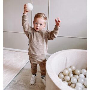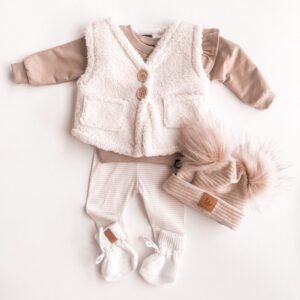 Pleten bež pulover je univerzalno privlačen in enostaven za kombiniranje z drugimi kosi oblačil, kar omogoča številne modne kombinacije. Klasičen kroj puloverja zagotavlja svobodo gibanja, obenem pa nudi dovolj toplote, da bo vaš dojenček vedno prijetno ogret. Rebrasti zaključki na rokavih in robu dodajajo puloverju pridih prefinjenosti in zagotavljajo, da pulover lepo ostane na mestu.